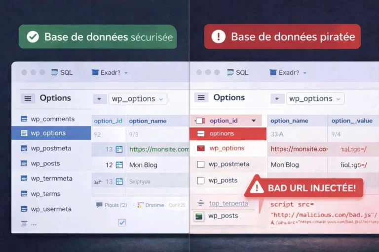 La base de données est un autre angle critique. Les pirates injectent parfois des fragments HTML, JavaScript ou des URL toxiques dans wp_posts, wp_options, les widgets, certains constructeurs de pages ou des tables personnalisées. Cela explique pourquoi un site peut sembler propre côté fichiers tout en continuant à générer des liens spam pour les visiteurs non connectés ou pour les robots des moteurs.